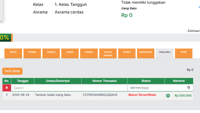 9. Cek status pembayaran pada halaman akun santri pada bagian administrasi dan uang saku