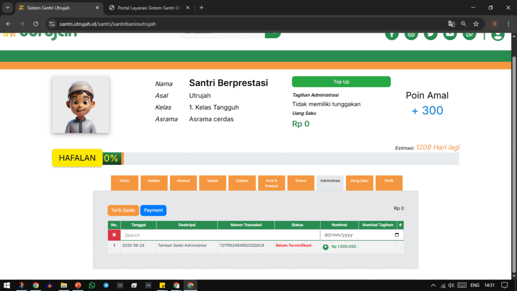 • Menghubungi Admin Sistem Santri Utrujah atau Bagian Keuangan Pondok untuk bantuan lebih lanjut.